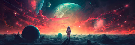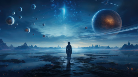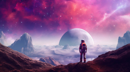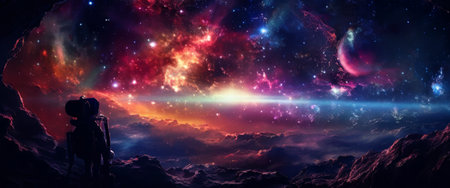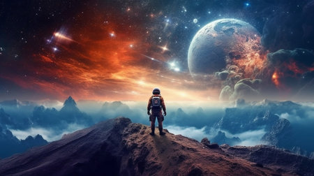 Standing on a planet, an astronaut looks up into the vast cosmos using Generative AI.