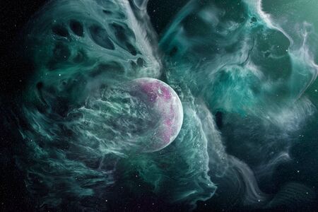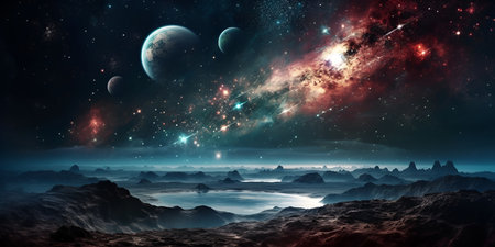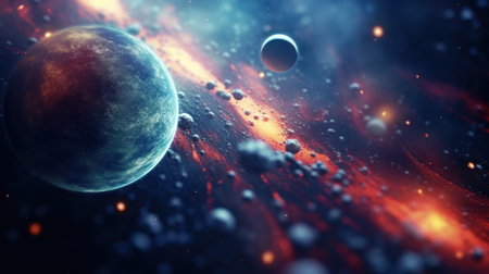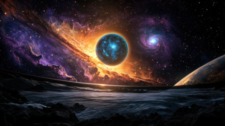 Vibrant cosmic nebulae and planets in deep space universe. Background for technological processes, science, presentations, education, etc