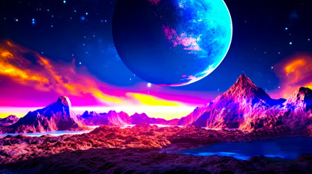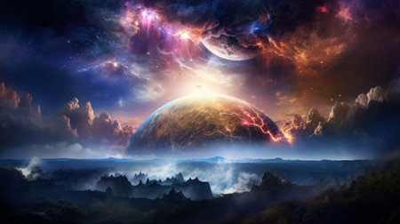 Fantasy landscape of a distant planet with a vibrant nebula and two moons
