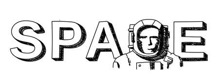 Word space hand-drawn lettering. Cartoon vector clip art of a word space typography with a portrait of an astronaut in a spacesuit. Black and white sketch of the space concept. Conceptual art