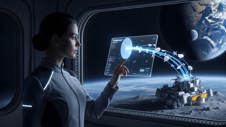 Astronaut showing astronaut interacting with space station hologram in orbit above earth.