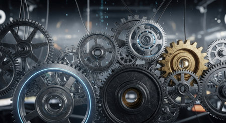 This close-up image showcases intricate metallic gears and cogs, highlighting the precision and complexity of modern machinery. The soft lighting emphasizes the fine details and craftsmanship, evoking a sense of technological advancement.