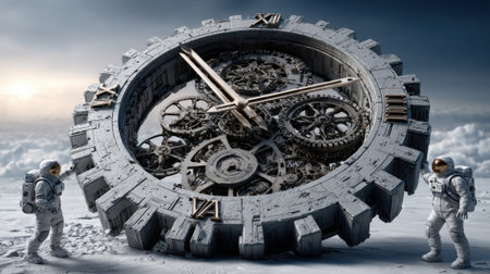 Two astronauts stand beside an enormous clock made of gears in a dreamlike setting. The clock towers above the clouds, reflecting an otherworldly atmosphere during twilight.