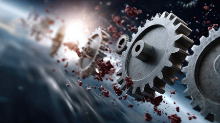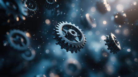 This captivating image showcases a series of metallic gears in motion against a cosmic backdrop. Vivid colors and floating particles enhance the sense of dynamism and innovation, perfect for technology or design-themed projects.