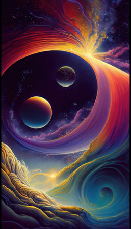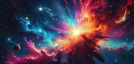 AI Generated. A dynamic abstract background with fluid shapes and bursts of color that mimic the chaotic beauty of a cosmic nebula