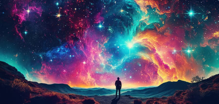 Man standing on the top of mountain and looking at the nebula