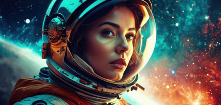 Astronaut woman in space. Cosmonaut in outer space.