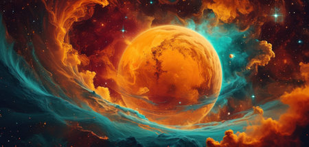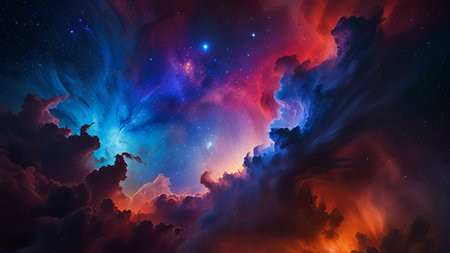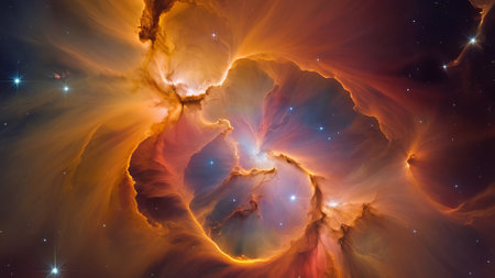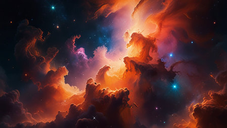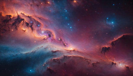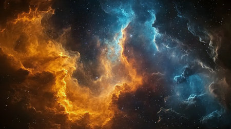 Colorful cosmic clouds swirl together, showcasing a brilliant mix of orange and blue against a starry backdrop, creating a mesmerizing display of celestial beauty in deep space.