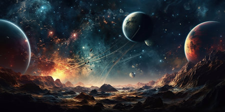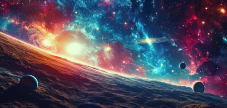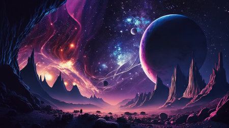 Space abstract background with planets and stars, cosmic landscape in neon colors, AI generated