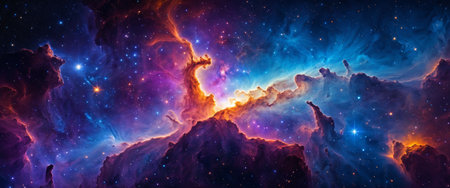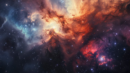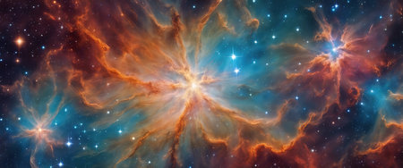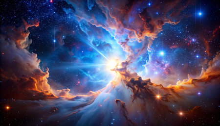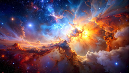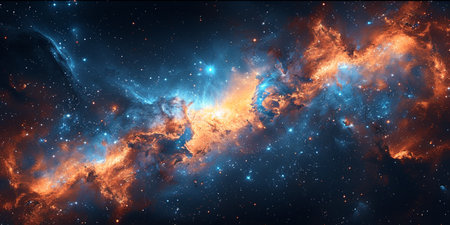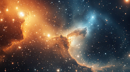 A stunning celestial nebula illuminates the cosmos with vibrant hues of orange and blue, surrounded by countless twinkling stars in deep space.