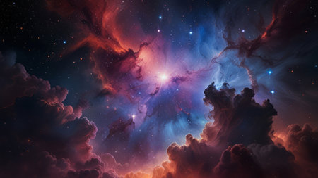 Beautiful colorful cloud nebulas and stars in dark night cosmos, scenic vivid astronomy and space science background, AI generated
