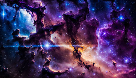 A vibrant cosmic nebula image showcases towering pillars of gas and dust illuminated by brilliant stars, creating a scene of celestial beauty.
