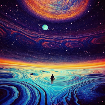 Man standing on the surface of the ocean with a planet in the background