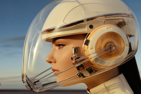 Female astronaut wearing a helmet and looking away. AI generative