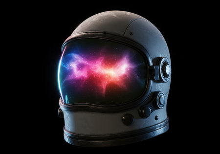A detailed astronaut helmet with a visor reflecting a vibrant, swirling nebula and cosmic dust.