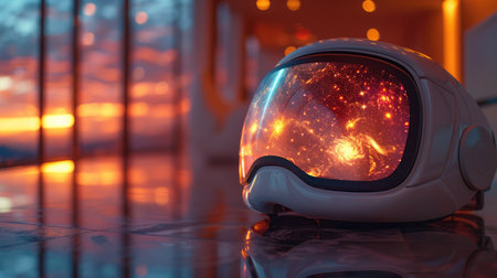 Exploration helmet on display against a starry background