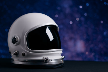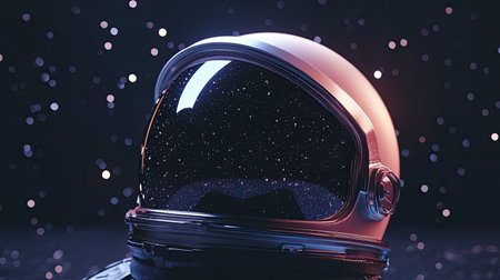 A distinct astronaut helmet displayed against a white background, showing its sleek design and reflective visor. The visor reveals a starry sky, enhancing the space theme.
