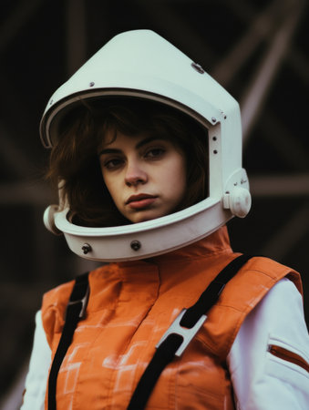 A close up reveals the resilience in the eyes of a female astronaut, adorned in a sleek spacesuit a portrait of strength in the vastness of space