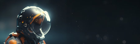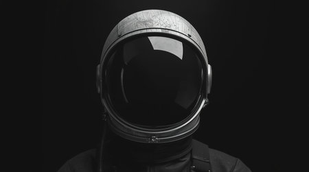 A striking portrait of a futuristic astronaut wearing a sleek space helmet. The dark background enhances the sense of isolation and exploration in deep space.