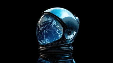 A reflective astronaut helmet showcases a vivid view of Earth from space, highlighting continents and oceans while resting on a dark surface.