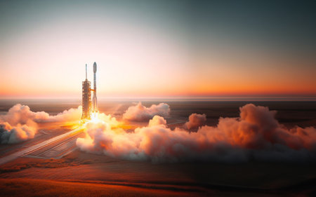 Powerful rocket launching into dramatic sky with fiery trail and billowing clouds captured in stunning detail and clarity. concept of space exploration, engineering, innovation.