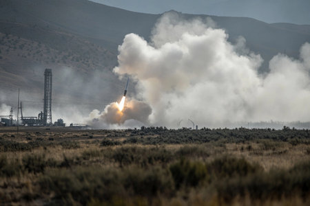 A spectacular launches unfolds as a rocket soars from its launchpad, leaving behind a trail of smoke in the early morning light, illuminating the rugged terrain of a distant mountain range.