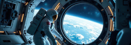 Cosmonaut looking at planet earth through a porthole with vast space and stars in the background