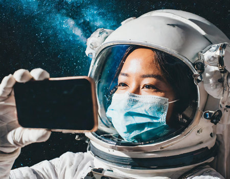 Asian young woman in spacesuit taking selfie with mobile phone in the outer space