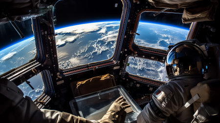 astronaut, gazing out of the window of spaceship, with view of the earth visible below, created with generative ai