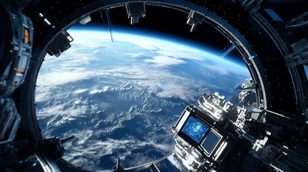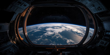 A cosmic view of the planet Earth and the vast expanses of the Universe from the porthole window of the ISS space station.