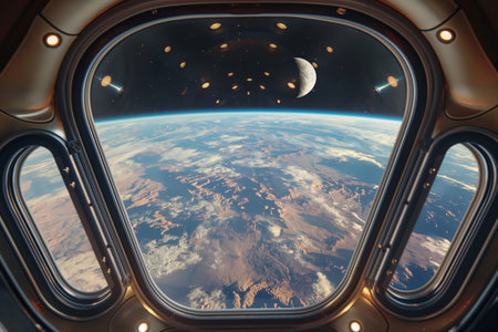 Awe inspiring view of earth and the moon from a spacecraft window, showcasing the beauty and vastness of space exploration