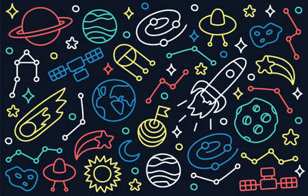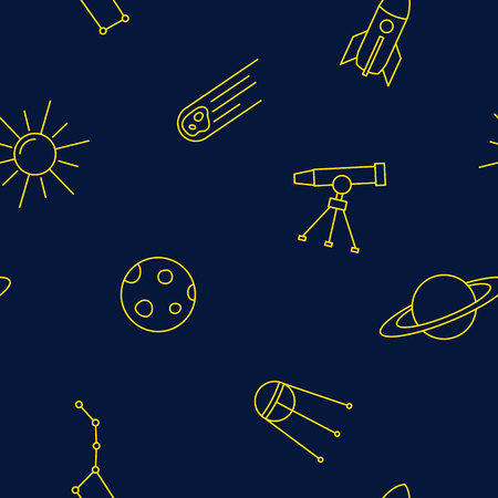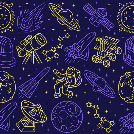 Seamless pattern of outline space icon planet spaceship, asteroid and others flat vector illustration on dark background.