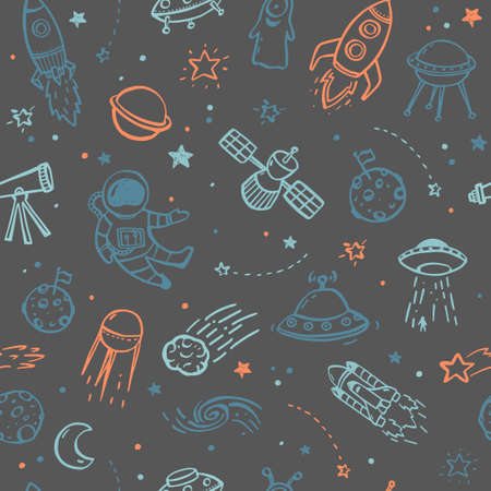 The universe, the cosmos. Seamless pattern. Doodles of planets, stars, spaceships and satellites Vector background,