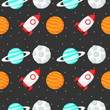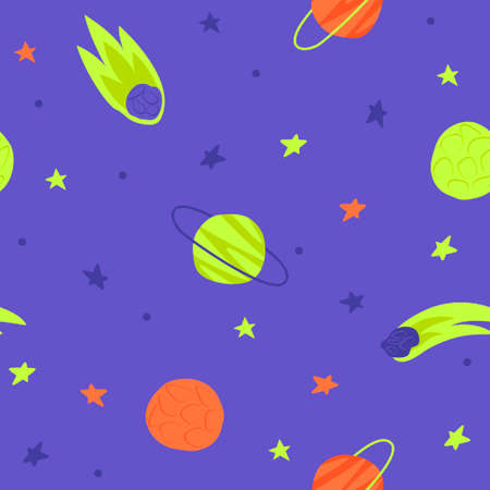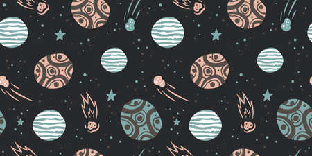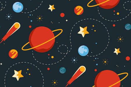 Lovely outer space planets vector flat seamless pattern with asteroid, comet, stars. Ideal for wrapping paper printable, website background, wallpaper and fabric design. Artwork on separate layer