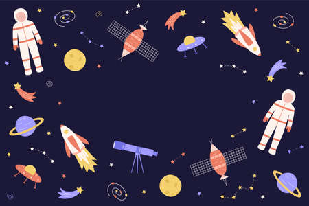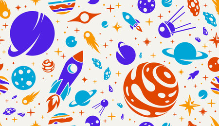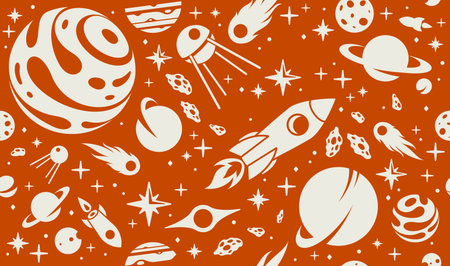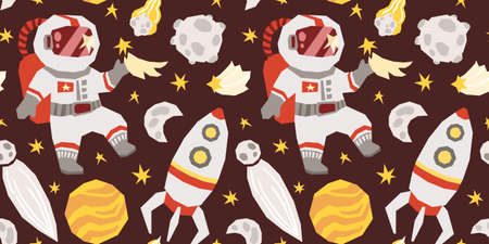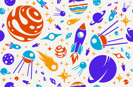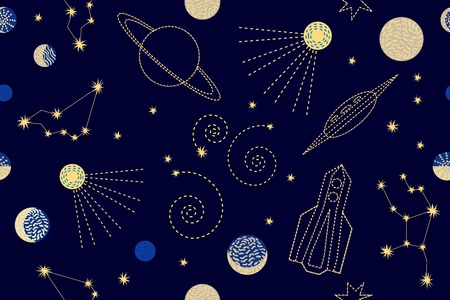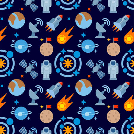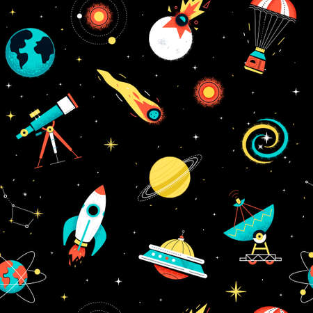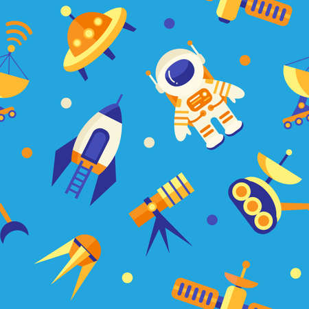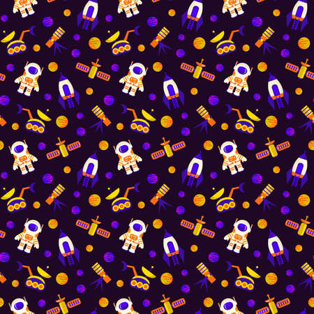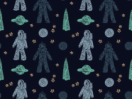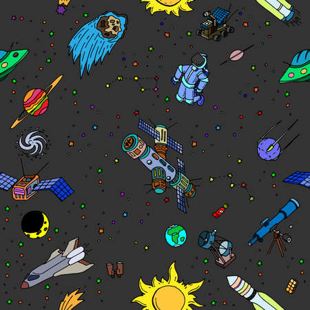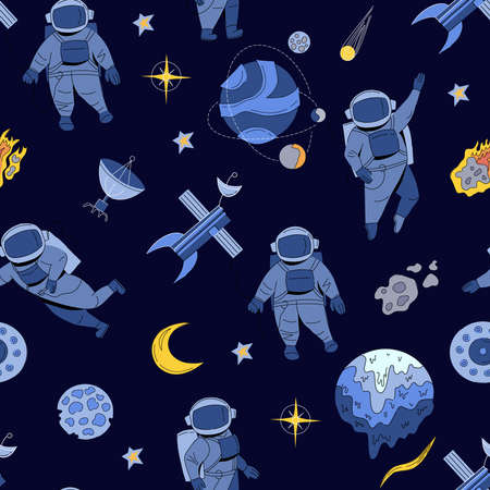 Vector abstract seamless pattern of an astronaut, planets, galaxy, asteroids, stars, moon, shuttle, space station and technology. science fiction drawing for poster, cover or background.