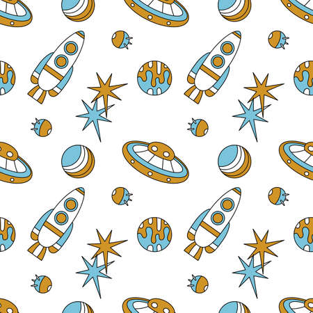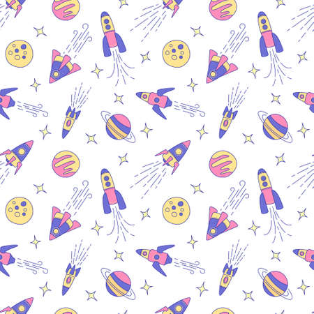 Seamless pattern with rockets, planets and star on white background. Color vector illustration in outline style.