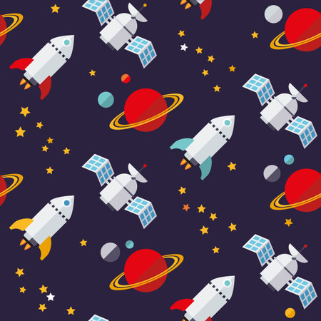 Exploring space seamless background, vector cartoon rockets flying among planets and stars endless wallpaper, astronomy school education for children tiling pattern.