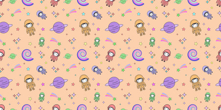 Flat cartoon style funny galaxy seamless. Astronaut with rocket and alien in the open space Cute design for kids fabric and wrapping paper. Galaxy seamless pattern design.