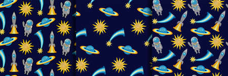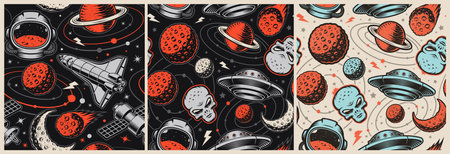 Set of Space seamless patterns in vintage style with design elements such as flying saucer, alien, planets, space satellite, shuttle, moon