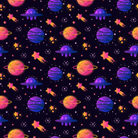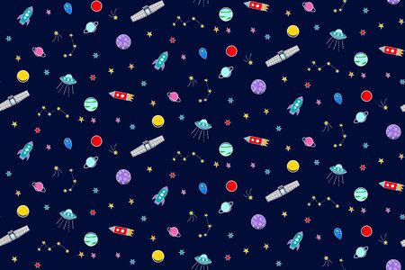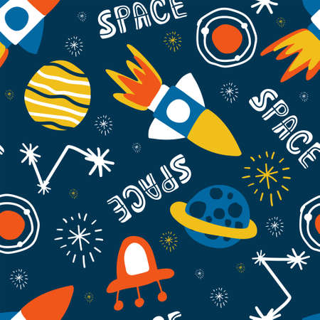 Vector Colorful Seamless Pattern with Cartoon Rockets, Planets, Stars, Spaceship, Comets and UFOs. Vector fantastic space texture. Perfect for kids design, fabric, wrapping, wallpaper, textile, apparel.