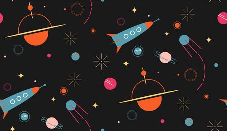 Seamless vector pattern with spaceship and planets on black background. Simple galaxy wallpaper design for children. Cartoon rocket fashion textile.