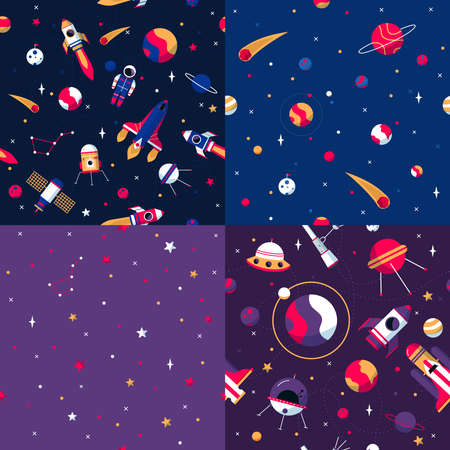 Space seamless patterns samples 4 flat icons square composition with colorful spacecrafts and planets abstract vector illustration