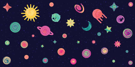 Childish cosmos pattern with stars, comet, sun and saturn planet