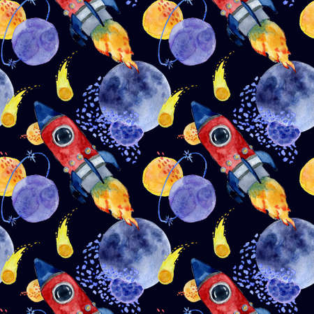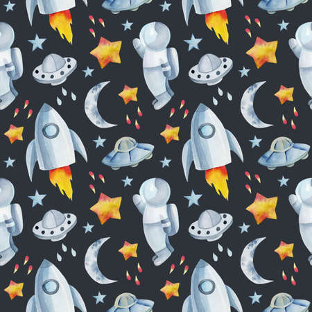 Seamless pattern of watercolor space elements (rocket, astronaut, ufo, stars), hand drawn illustration on dark background
