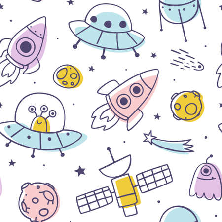 Outline doodle space pattern. Cosmic seamless print with spaceship and aliens for kids.