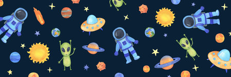 Hand drawn watercolor Space horizontal background for Kids with space Rocket, Planets, Stars, Astronaut, Comets and ufo on dark background.