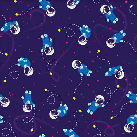 Outer space seamless pattern with astronaut, planets, constellations and other cosmic objects. Colorful design for prints on paper, fabric and clothes. Vector illustration in cute cartoon style