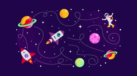 vector illustration of cosmos and planets in neon bright colors on dark blue background