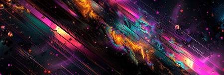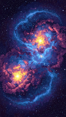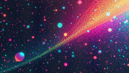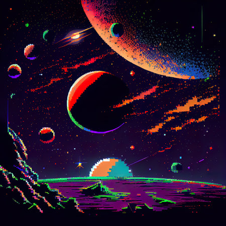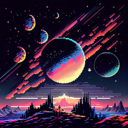 Abstract cosmic pixel art background with neon spheres and streaks