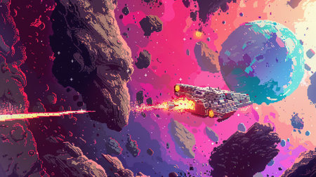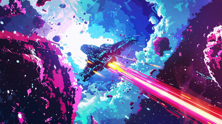 Old school 8bit video game scene, spaceship attacking, retro gaming nostalgia
